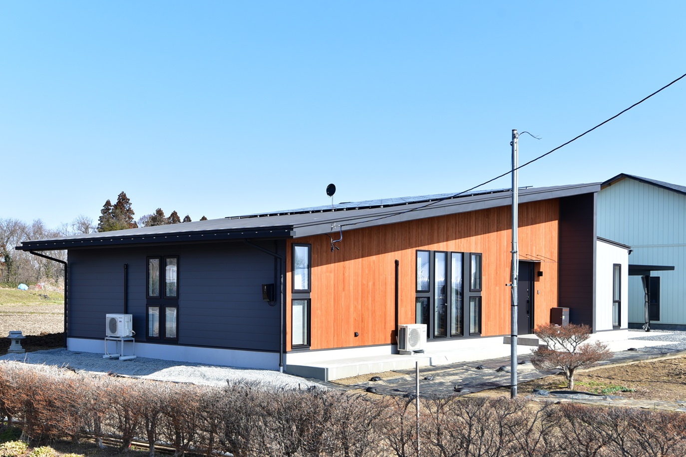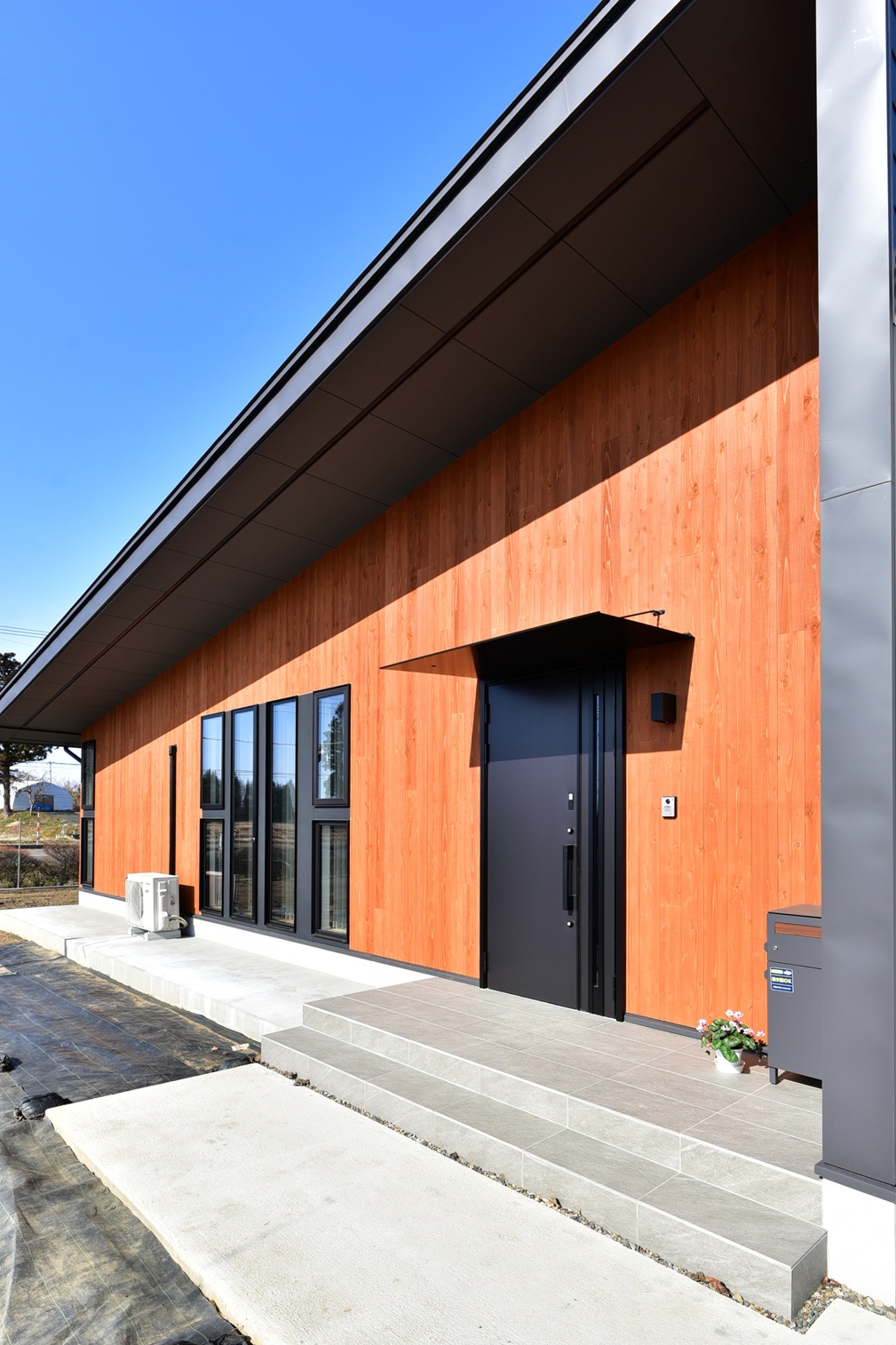 木の外壁とブラックの外観を組み合わせ、落ち着きのある佇まいに仕上げました。
