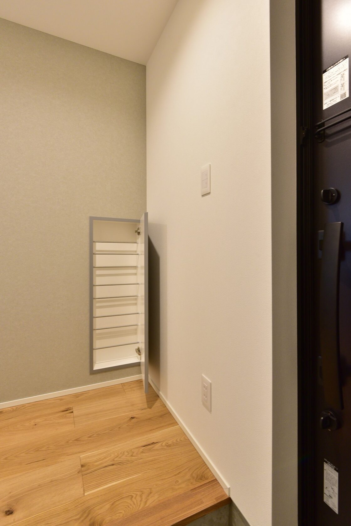 来客用スリッパをすっきり収納できるニッチタイプのスリッパBOXや、シューズインクロークを備えた玄関は、いつも整った印象でご家族もお客様も気持ちよく迎えられます。